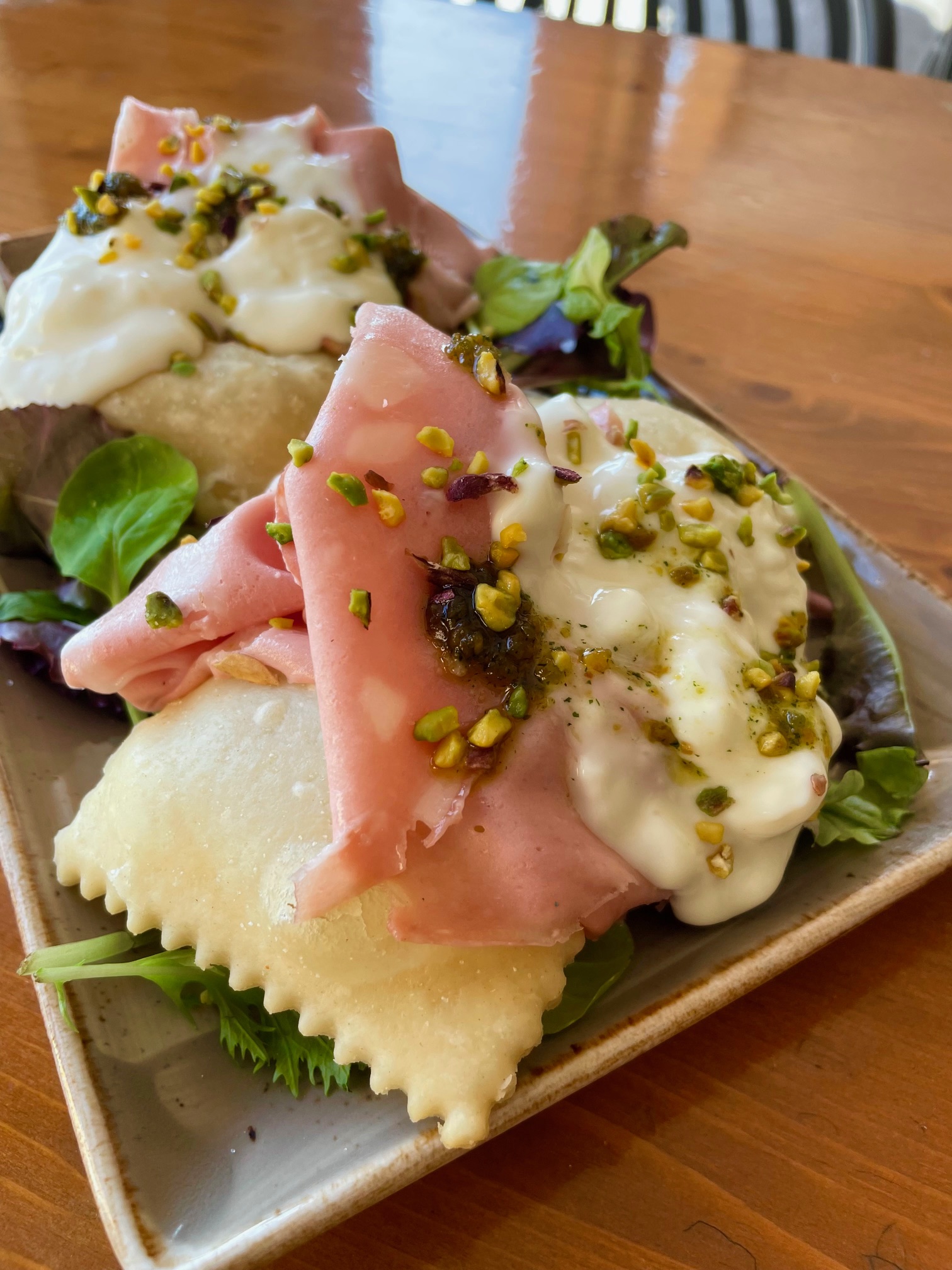 Gnocco fritto con mortadella favolosa modenese, squacquerone, gocce di pesto e pistacchi.