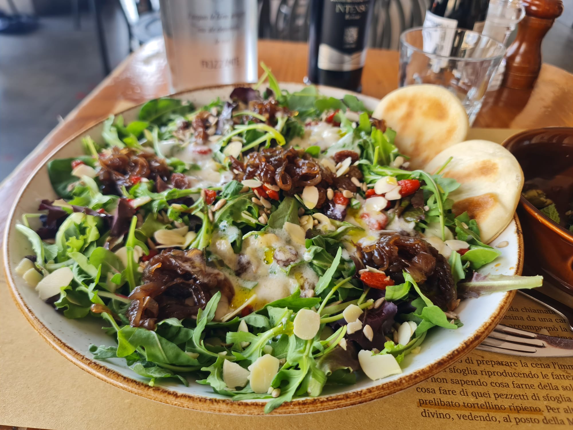 Misticanza, rucola, uva sultanina al sentore di vinaccia, crema di parmigiano reggiano, scaglie di mandorle tostate, cipolla