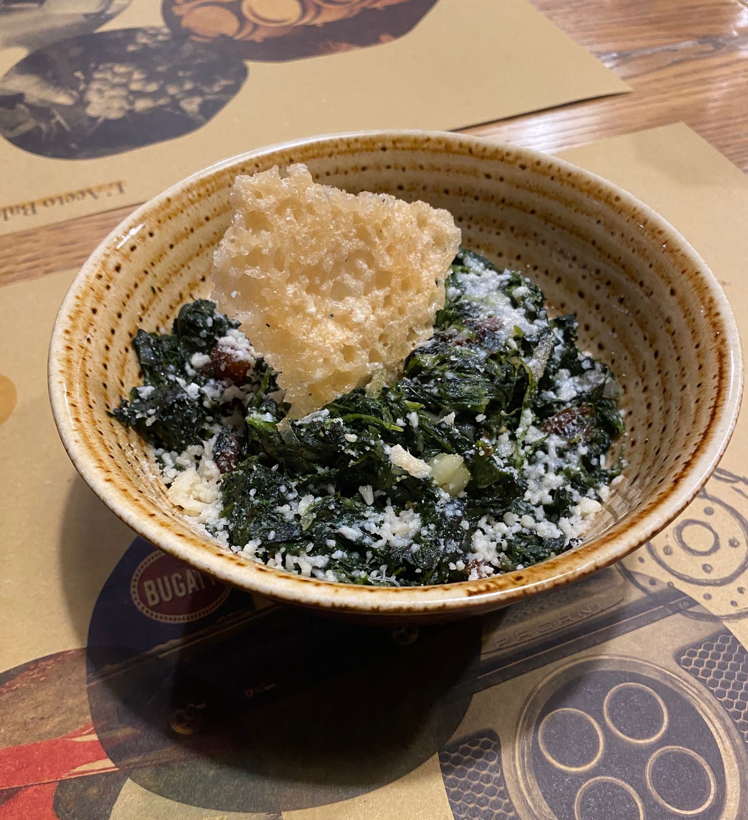 Sauteed spinaches with raisins, pine nuts, onion, a few pepper, parmigiano au gratin and parmigiano crumble