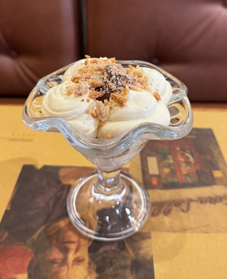 Smaller version of the jewel of rome: cup with sweet mascarpone cream, hazelnut cream, crumbled homemade red wine cookies and a small addition of pistachio granules