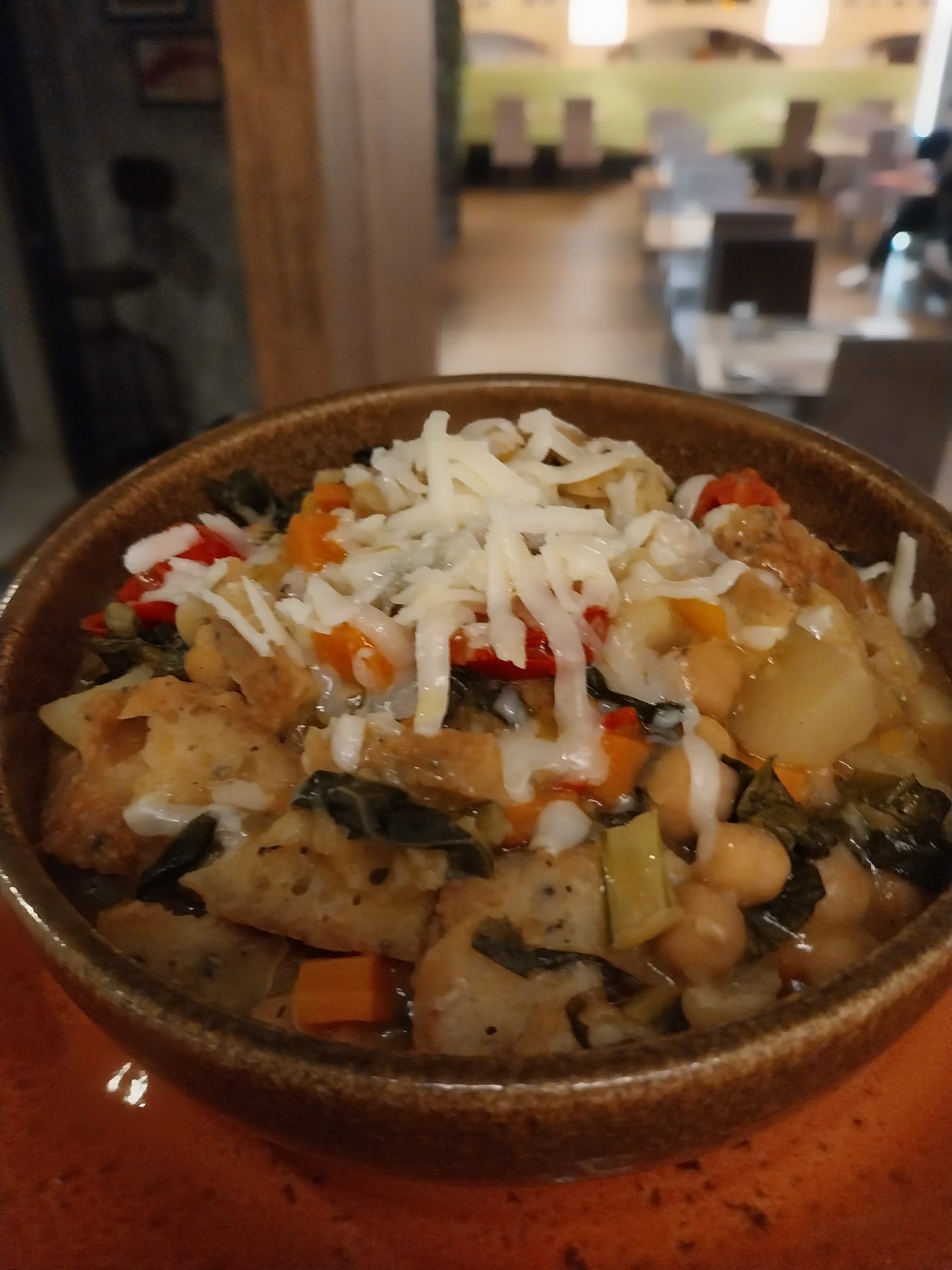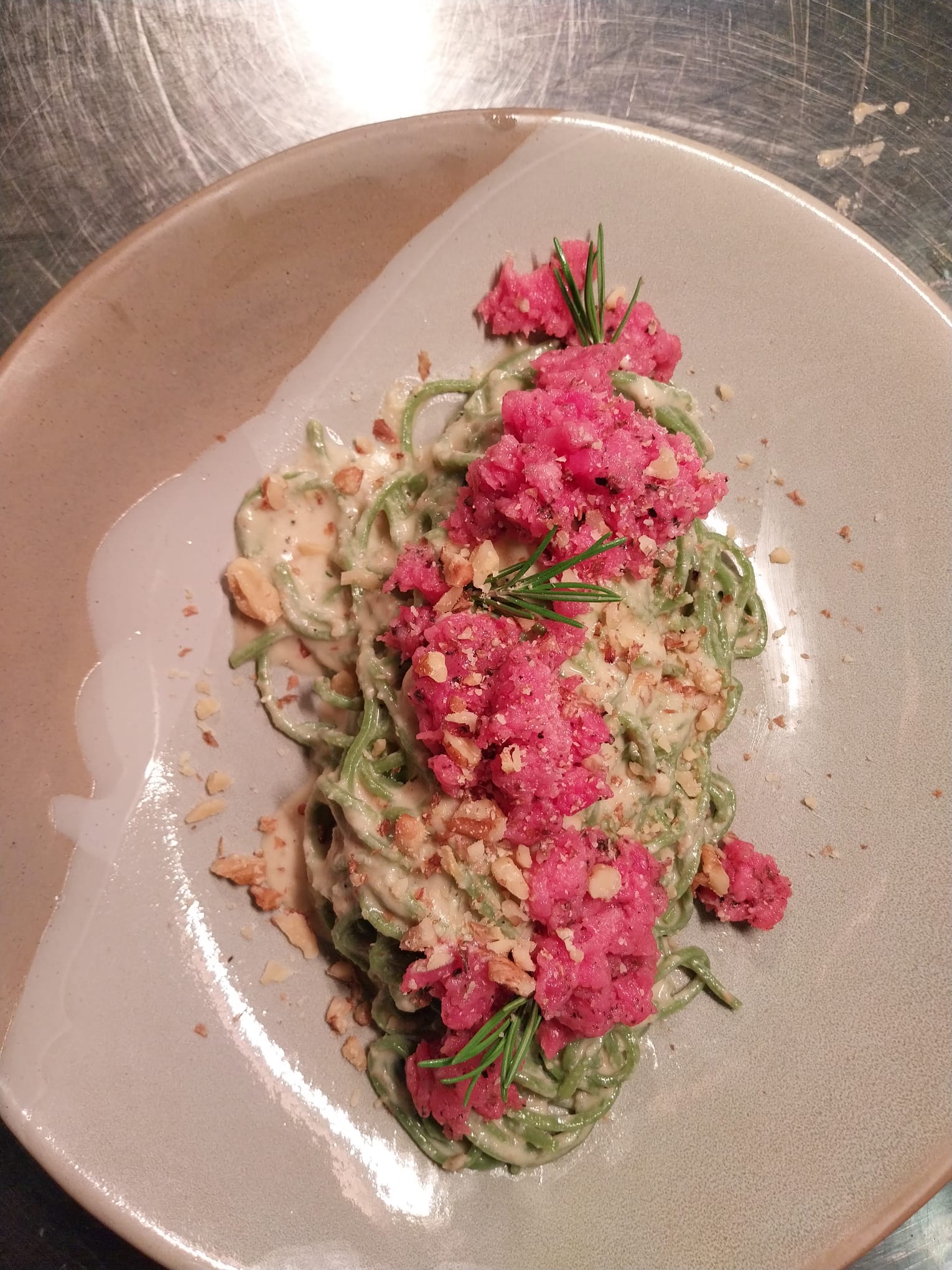 Green gnocchi with pecorino cream with carrot chips, hazelnuts and sesame seeds