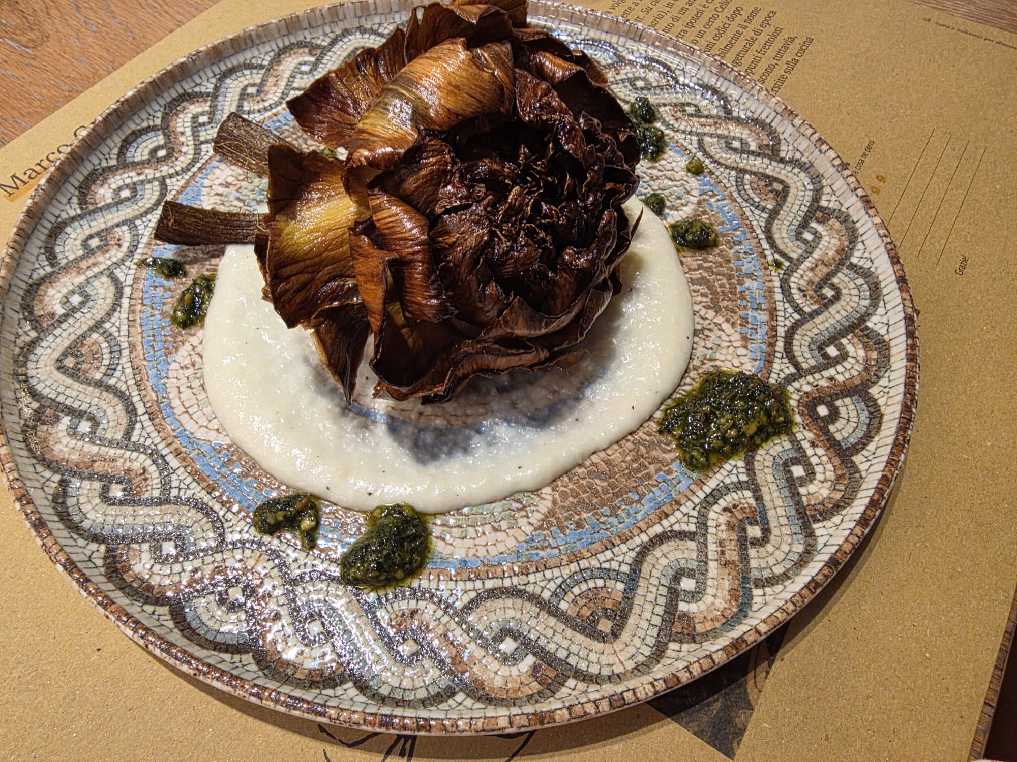 Carciofo fritto su crema di pecorino e pesto alla menta.
