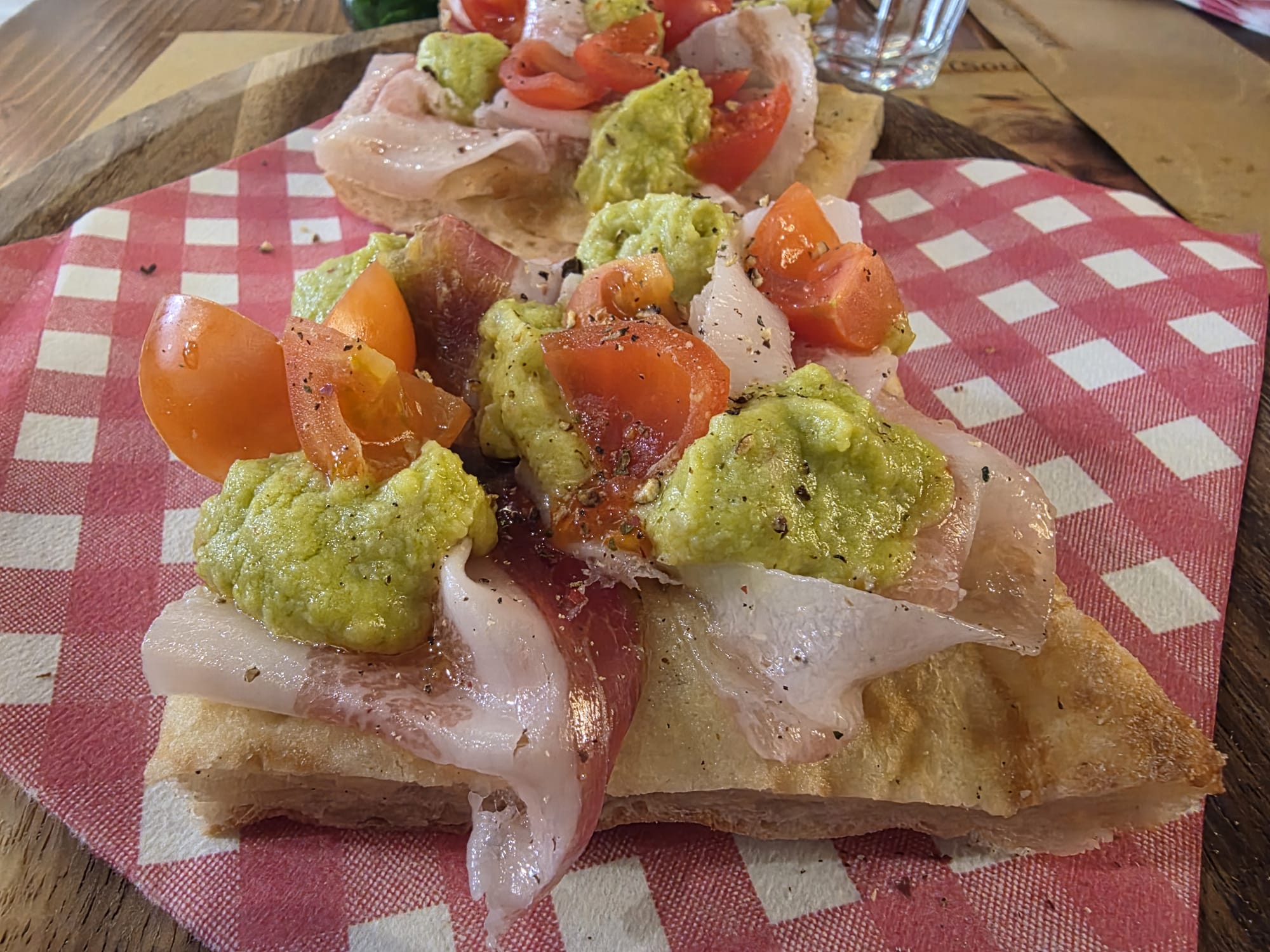 Pinsa con guanciale, guacamole di fave, pomodorini e pepe
