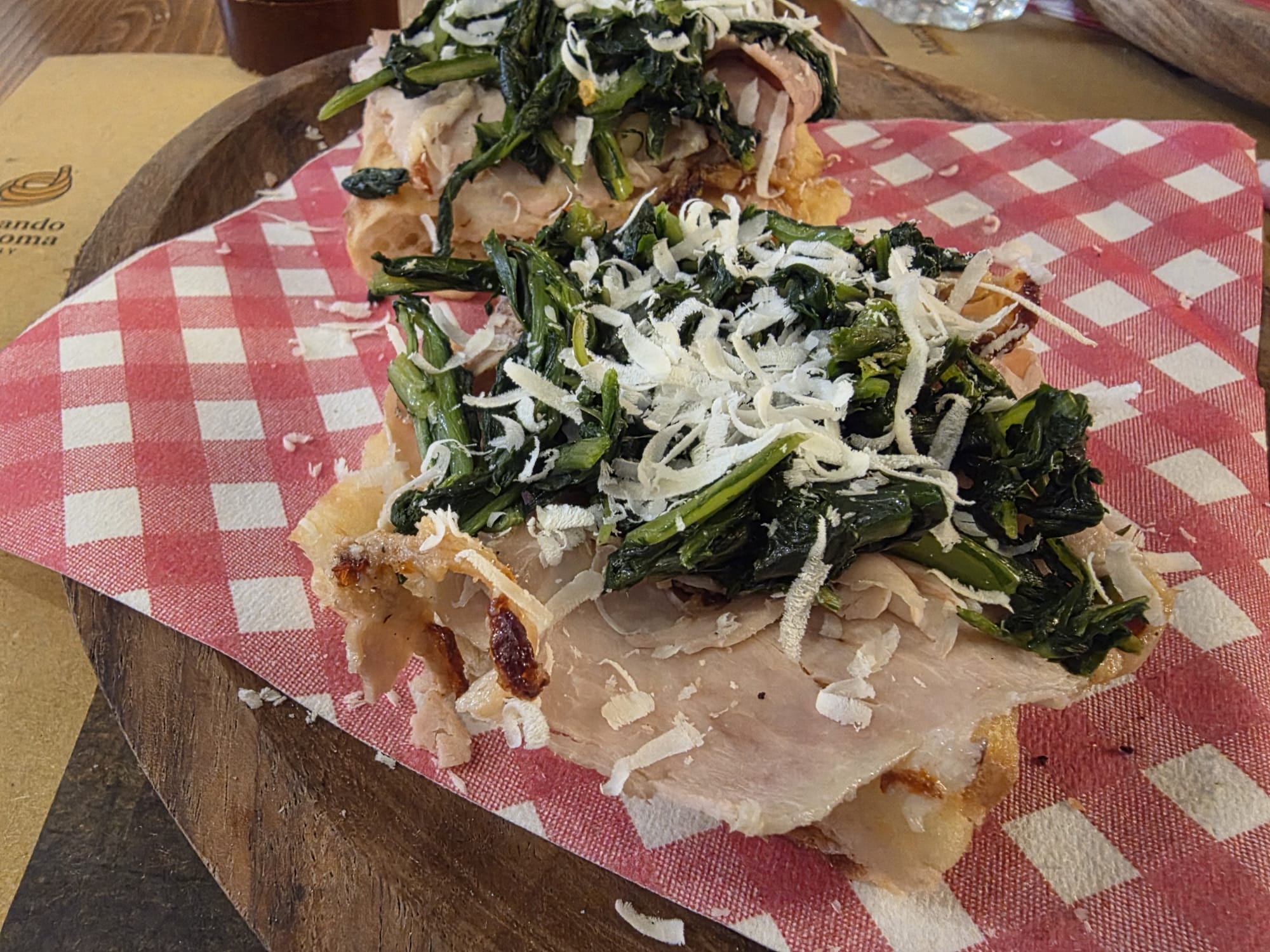 Porchetta di ariccia con pecorino di amatrice e salsa di stagione suggerito abbinamento con pinsa e cicorietta spadellata