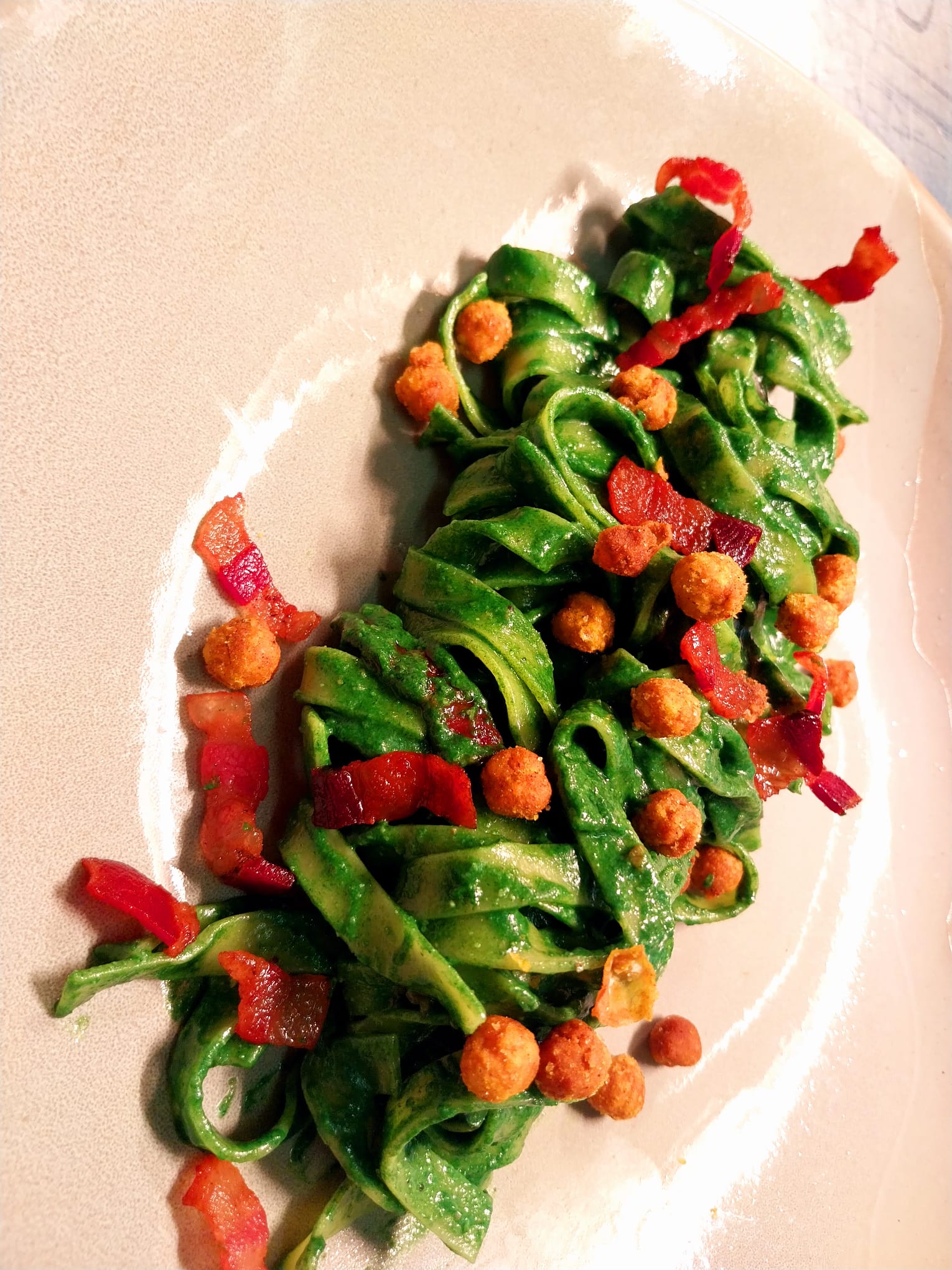 Spaghetti verdi con pesto di noci e tartare al tartufo