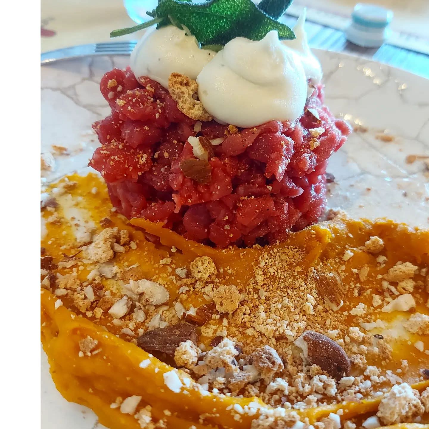 Con fior di cappero, cipolla di tropea, tuorlo d'uovo, salsa worcestershire e due gocce di tabasco. il tutto servita su cestino di parmigiano con salsine a parte schiacciata servita a parte